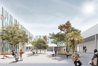 Dispondrá, asimismo, de un salón de actos con acceso desde el exterior para poder ser usado fuera del horario escolar. Tendrá también cafetería, porche exterior cubierto, zonas ajardinadas y área de estacionamiento para vehículos.